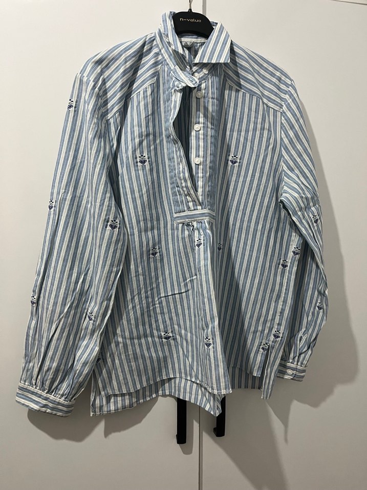 Mavi çizgili pamuklu gömlek, uzun kollu ve yakalıdır. Yarıya kadar Düğmeli ön normal midi boyu ve rahat kesimiyle günlük kullanıma uygundur. 40beden yurt dışından alındı