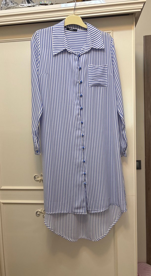 Mavi çizgili, uzun kollu, pamuklu, bol kesim kadın gömlek. Düğmeli önü, kayık yaka ve göğüs cebine sahiptir. Rahat günlük stil için uygundur.