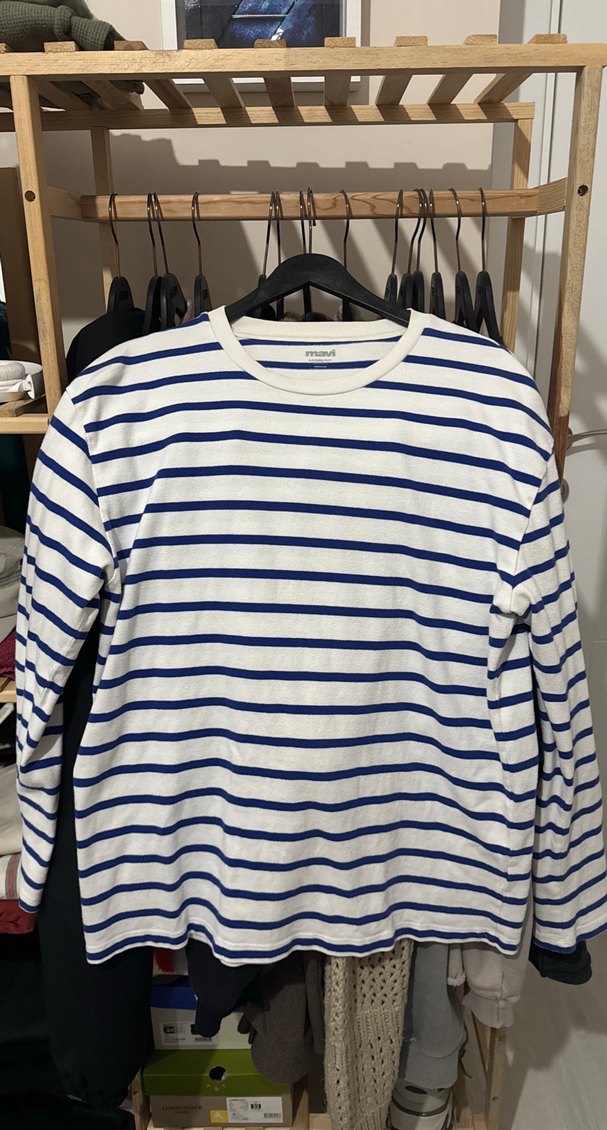 Mavi çizgili uzun kollu hamile tişörtü, yuvarlak yaka ve rahat kesimlidir. Yumuşak pamuklu kumaştan, günlük kullanım için uygundur.