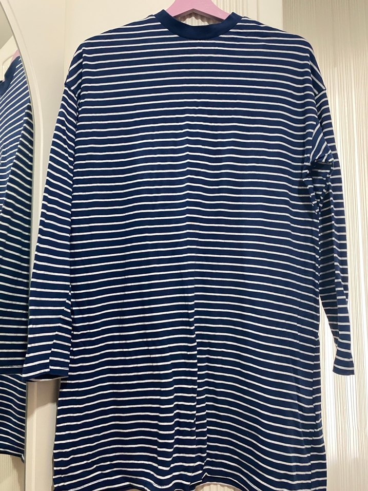 Pamuklu, mavi-beyaz çizgili, uzun kollu, bol kesim tişörtü. Yuvarlak yaka ve pile detaylı, günlük kullanıma uygun.