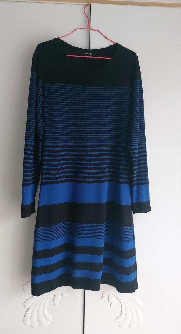 Uzun kollu, kayık yaka ve pile detaylı, mavi çizgili triko elbise. Sentetik kumaştan, normal boyda ve vücuda oturan kesimde, günlük kullanıma uygun.