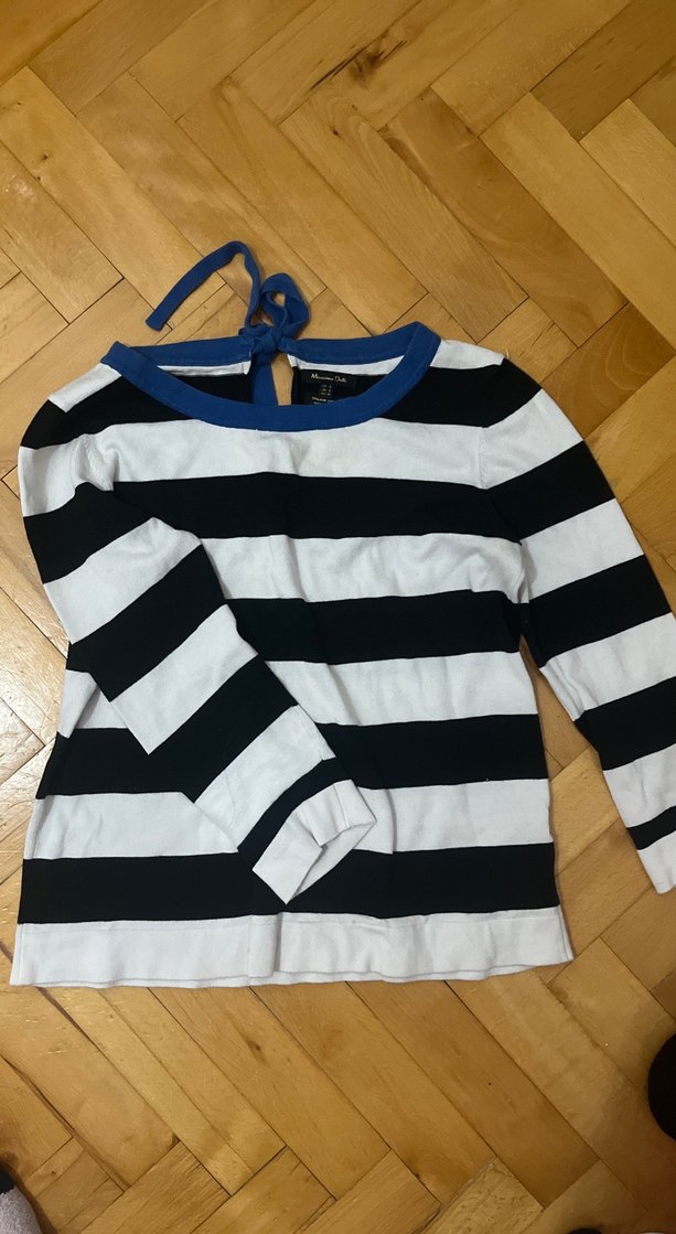 Pamuk kumaştan, uzun kollu ve tekne yaka, arkada bağlamalı tokalı mavi beyaz çizgili üst. Rahat ve salaş kesime sahip, günlük kullanıma uygun.