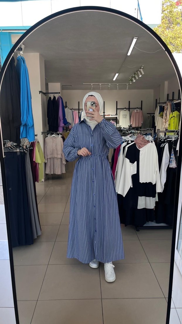 Pamuklu kumaştan, uzun kollu ve yüksek yakalı, bol kesim mavi çizgili uzun elbise. Pilili tasarımıyla günlük sade kullanıma uygundur. 1 adet 40 beden göğüs 96 cm kol 42 cm boy 136-137 cm
