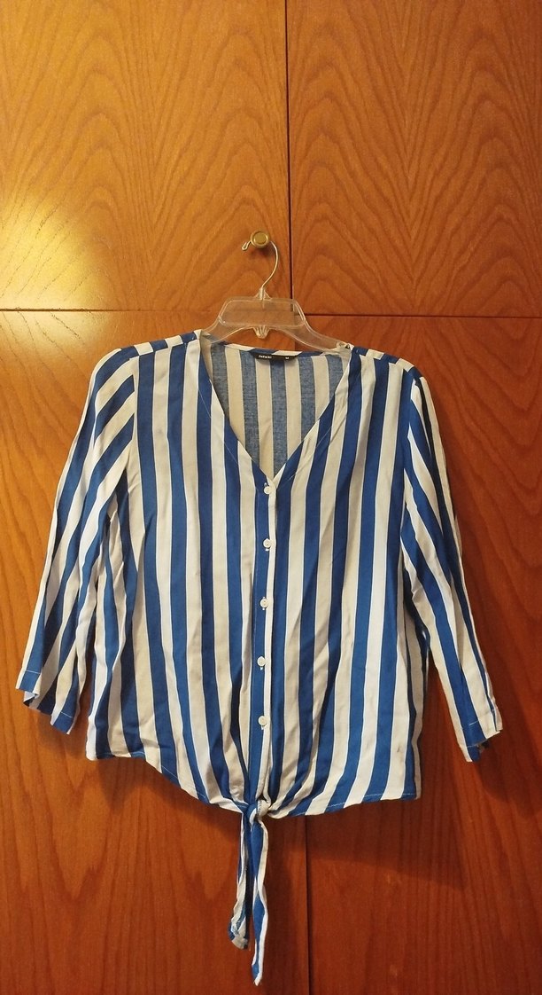 Mavi çizgili pamuk gömlek, uzun kollu, V yaka ve düğmeli önde bağlamalıdır. Salaş kesim ve parlak görünüme sahiptir, günlük rahat stil için uygundur.