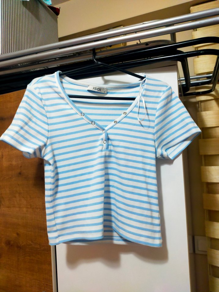 Pamuk kumaştan yapılmış, mavi çizgili, kısa kollu, düğmeli V yaka, normal boyda ve dar kesim kadın tişörtü. Rahat ve günlük kullanıma uygun.