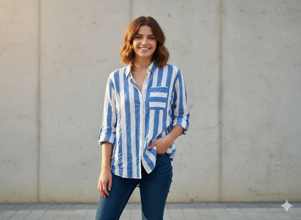 Mavi ve beyaz çizgili, V yakalı, düğmeli, cepli, uzun kollu, rahat kesim kadın gömleği. Denim kumaştan üretilmiştir.