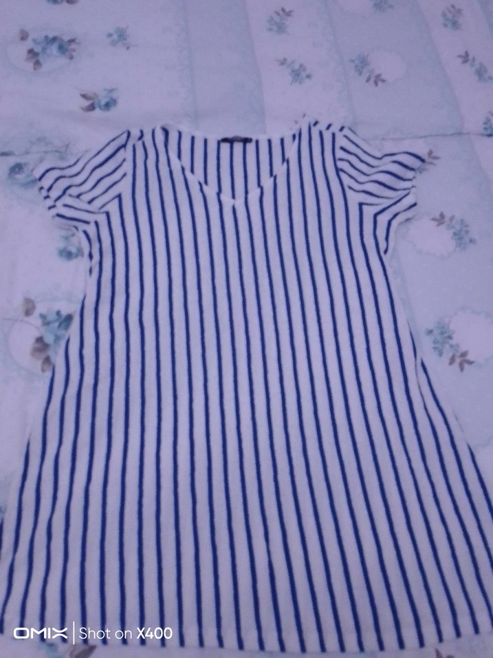 Mavi pastel çizgili, kısa kollu, V yakalı, pile detaylı, bol kesim kadın tişörtü. Yumuşak sentetik kumaştan, günlük sokak stili için uygun.