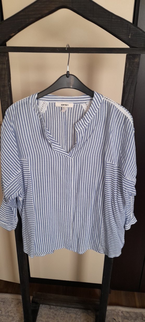 Mavi ve gri çizgili, keten kumaştan, V yaka ve uzun kollu bol kesim kadın gömleği. Düğme detaylı, günlük sokak stili için uygun.