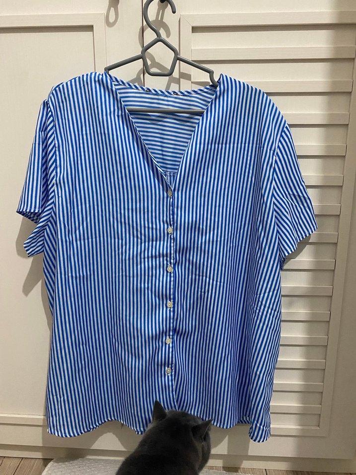 Mavi çizgili, kısa kollu, V yaka, düğmeli ve bol kesim kadın gömleği. Yumuşak kumaştan, günlük kullanıma uygun.