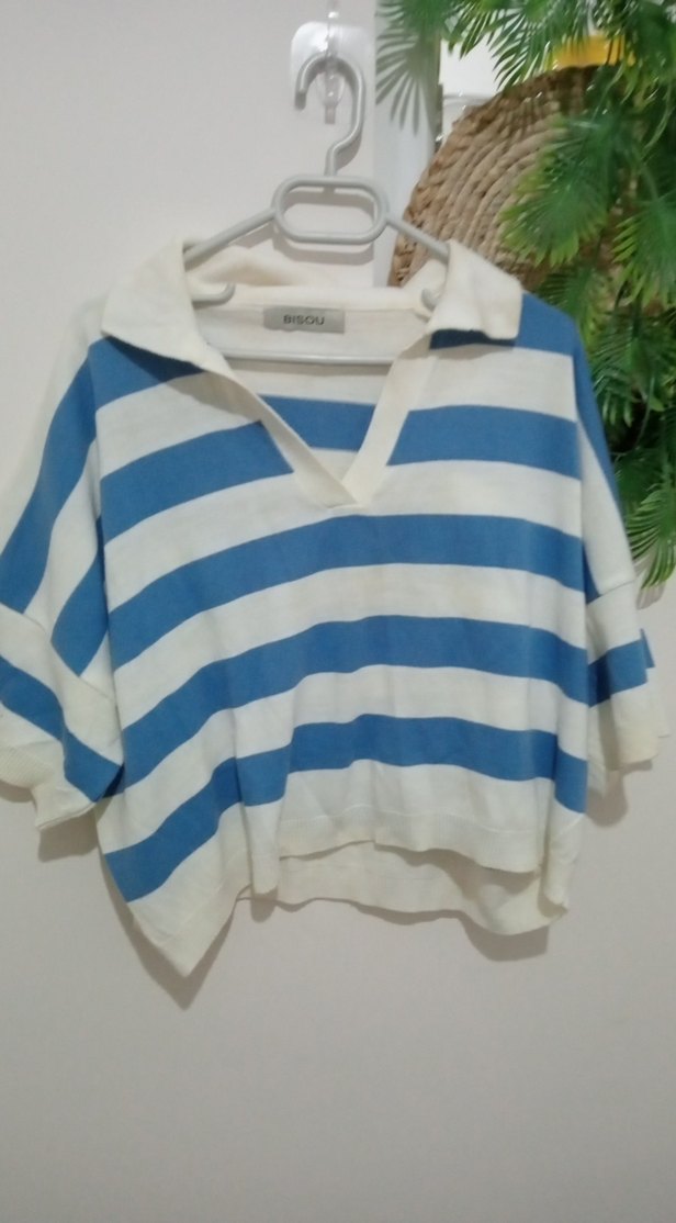 Pamuklu, mavi beyaz çizgili, V yaka kısa kollu, bol kesim kısa triko kazak. Günlük ve sokak stili için uygundur.
