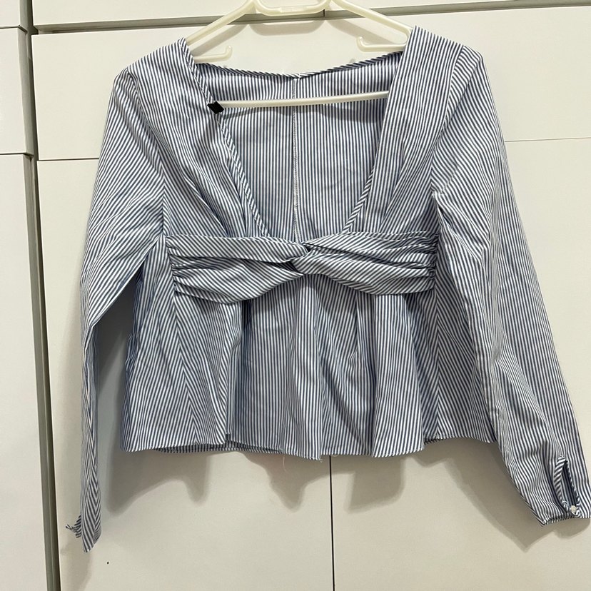 Pamuklu, mavi ve gri çizgili, V yaka, uzun kollu, pilili, normal boy, rahat kesimli kadın gömleği.