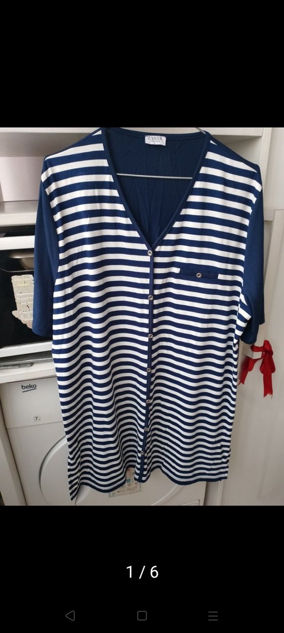 Mavi beyaz çizgili, kısa kollu, V yakalı ve düğmeli bol kesim bluz Pamuklu ve rahat kumaştan üretilmiştir.
