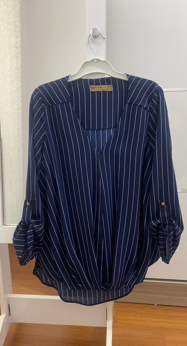 Koyu mavi, uzun kollu, V yakalı ve pile detaylı kadın gömleği. Salaş kesim ve çizgili desene sahip, ofis kullanımı için uygun. Sentetik kumaştan üretilmiştir.