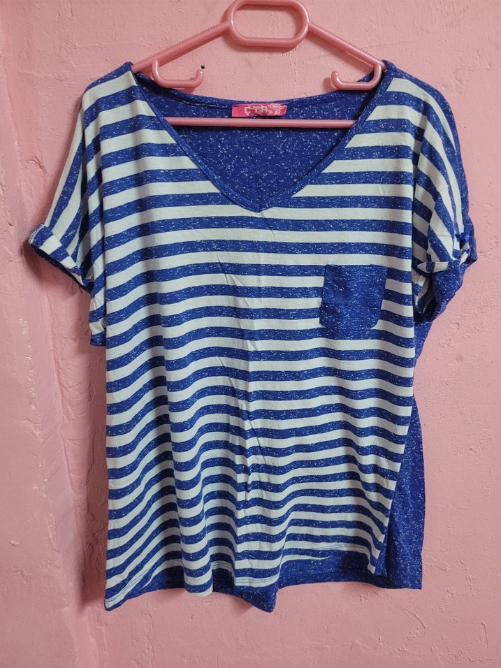 Mavi çizgili, kısa kollu, V yakalı, pamuklu, rahat kesim kadın tişörtü. Örgü dokusu ve küçük cep detayıyla gündelik kullanıma uygundur.