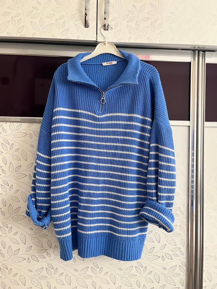 Mavi renkte, yarım fermuarlı yüksek yakalı, çizgili desenli uzun kollu bol kesim triko kazak. Rahat günlük sokak stiline uygun.
