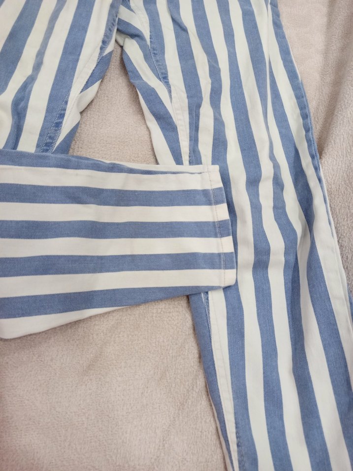Açık mavi ve beyaz çizgili, düğmeli, midi boy, bol kesim denim pantolon. Günlük kullanım için rahat ve şık bir seçenek.