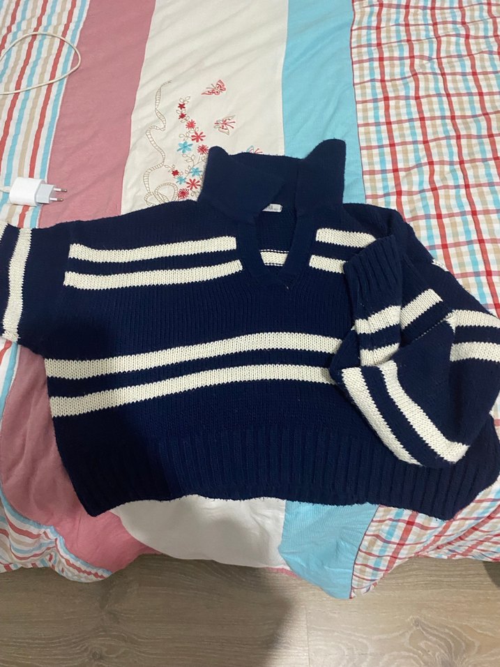 Koyu mavi renkli, beyaz yatay çizgili, yüksek yakalı ve uzun kollu örgü kadın kazak. Rahat ve bol kesim, gündelik kullanım için uygundur.