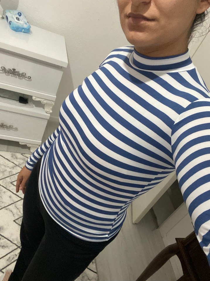 Dar kesim yüksek yakalı tişörtü, mavi ve gri çizgili desene sahip. Uzun kollu ve sentetik dokusu rahat bir şıklık sunar.