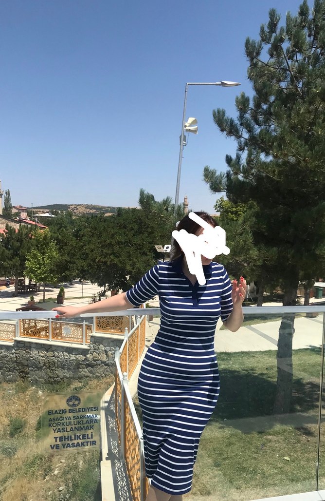 Mavi çizgili, yüksek yakalı, kısa kollu, diz boyu triko elbise. Vücuda oturan kesimi ve yırtmaç detayıyla sokak modasına uygun.