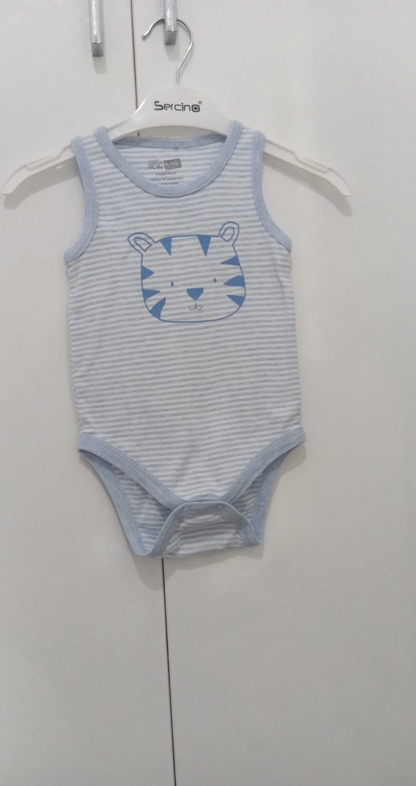 Mavi ve gri çizgili zebra desenli, kolsuz ve yuvarlak yakalı bebek body. Yumuşak sentetik kumaştan örülmüş yapıya sahiptir.