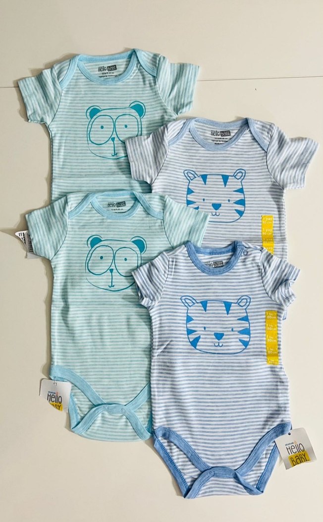 Yumuşak pamuklu, kısa kollu ve bisiklet yakalı bebek bodyleri, pastel mavi çizgiler ve zebra ile ayı desenleriyle rahat kullanım sağlar.