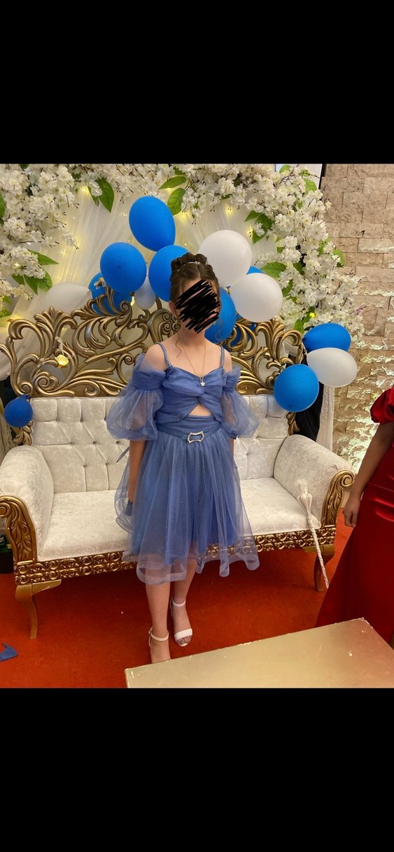 Açık mavi, ve drapeli, ince askılı kollara sahip dar kesim elbise. Yumuşak sentetik kumaşta hafif batik desen bulunur, gotik ve avangart tarzı yansıtır. Sadece bir kere giyilmiştir herhangi bir yerinde yırtılma yada lekelenme yoktur.