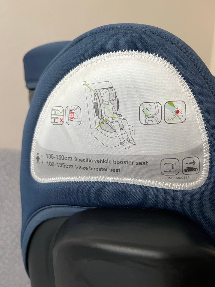 100-150 cm boyundaki çocuklar için mavi araba koltuğu yükselticisi, güvenlik talimatları ve sağlam tutturma özelliklerine sahiptir.