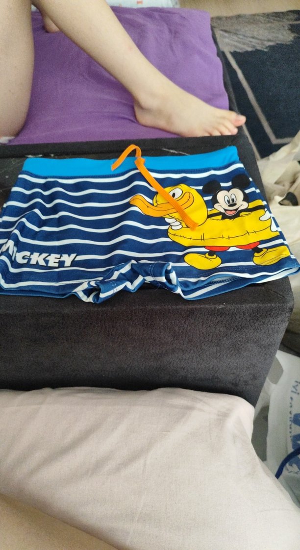 Mavi renkli, çizgili ve renkli Mickey baskılı çocuk mayo şortu. Lastikli bel ve yumuşak kumaş içerir. Üzerinde 'CKEY' yazısı bulunur.