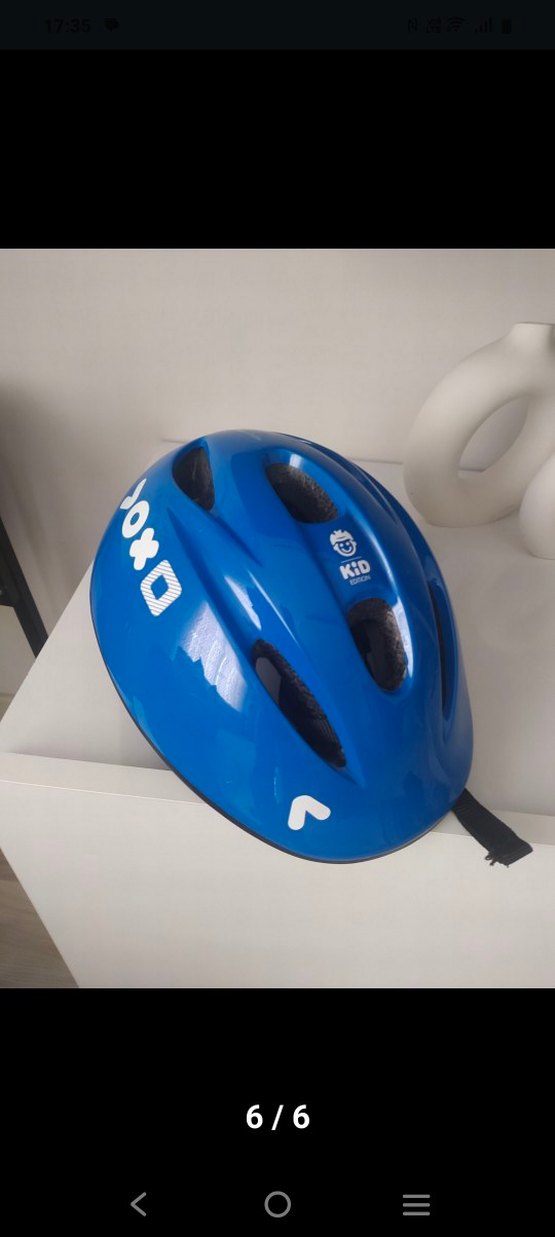 Mavi plastik çocuk bisiklet kaskı, renkli baskılı detaylar ve güvenli kullanım için Velcro bantlı. Minimalist ve sade tasarım.