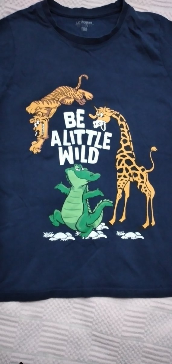 Koyu mavi renkte, kaplan, zürafa ve timsah figürlü, "BE A LITTLE WILD" yazılı yumuşak kısa kollu pamuklu tişört