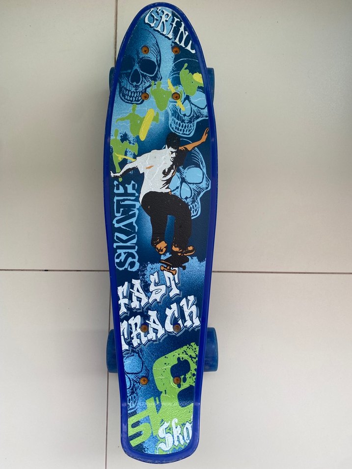 Mavi renkli çocuk kaykay, kafatası grafiklerine ve kaykaycı figürüne sahip renkli tasarımıyla genç sürücüler için uygundur.