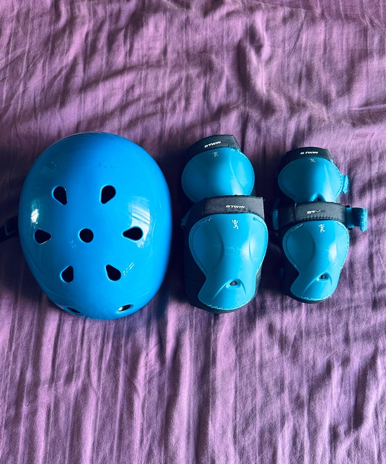 Mavi renkli, plastik malzemeden yapılmış çocuk koruyucu kask ve dizlik seti. Cırt cırtlı kapanışa sahip, desen içermeyen renkli tasarım.