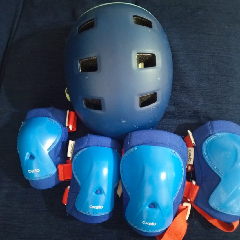 Mavi renkli, plastik malzemeden yapılmış kask, dizlik ve dirseklikten oluşan çocuk koruyucu seti. Renkli ve cırt cırtlı detaylara sahiptir. ️Xs beden