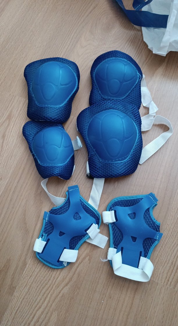 Diz, dirsek ve bilek koruyucularından oluşan mavi çocuk seti, dayanıklı plastik ve Velcro bantlarla sabitlenir. ️