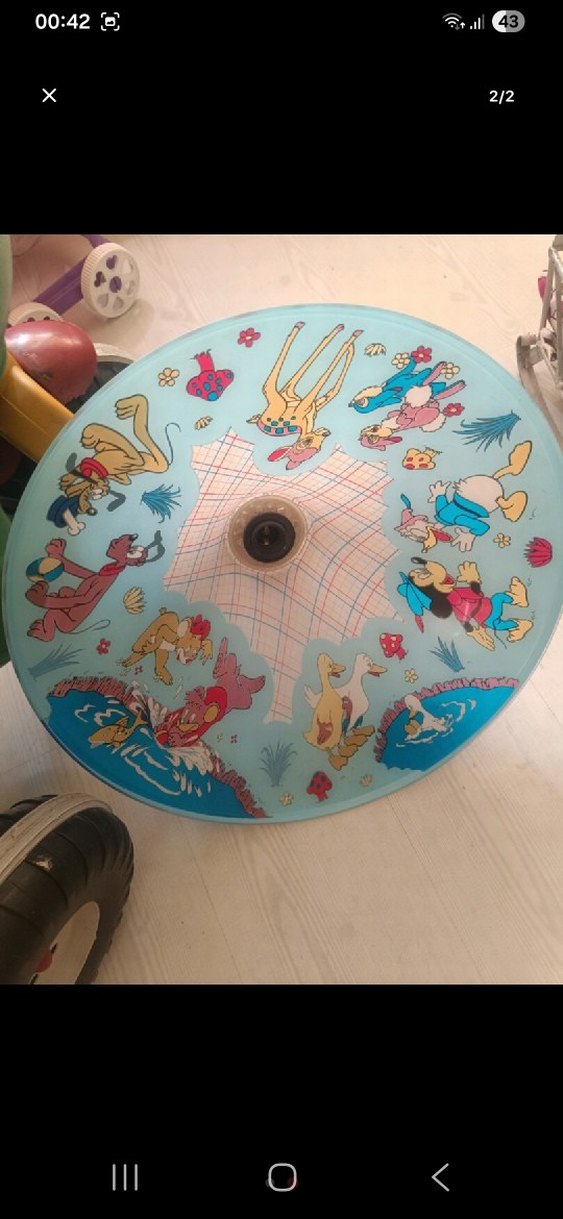 Orta kısmında şemsiye deseni olan, çevresinde renkli çizgi film karakterleri bulunan açık mavi tavan lambası. temiz kırık arızası yok..