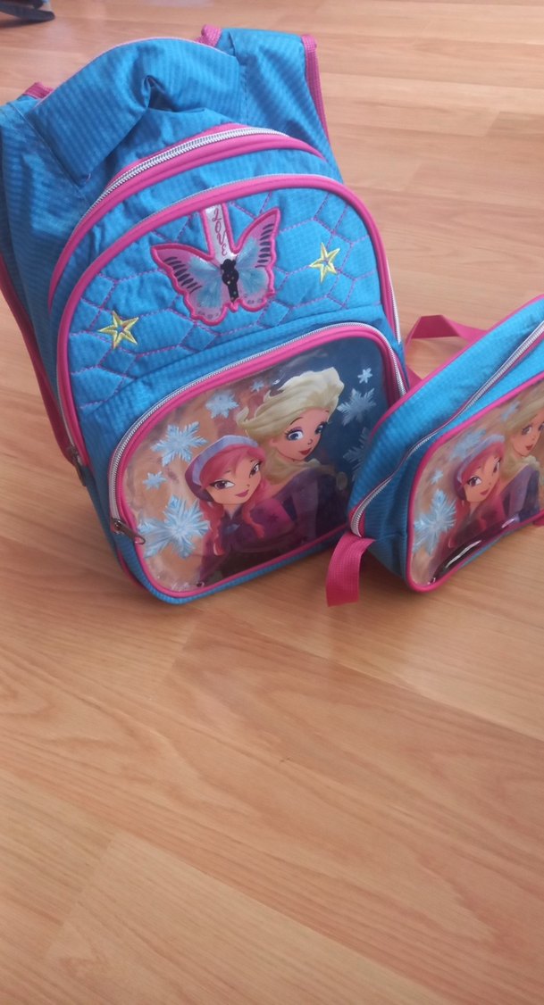 Mavi çocuk okul çantası, renkli kelebek ve yıldız nakışları ile ön cephesinde çizgi film karakterleri bulunur. 3 gözü var yeni hiç kullanılmadı besleme çantası da var