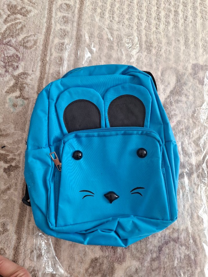Ön cephesinde sevimli yüz ve kulak detayları bulunan mavi çocuk okul çantası.