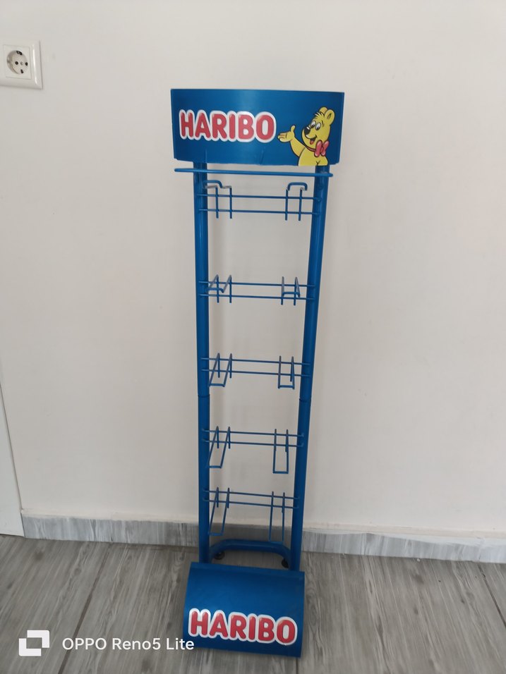 Mavi renkte, Haribo temalı çok katlı çocuk rafı, küçük eşyalar veya oyuncaklar için uygundur.