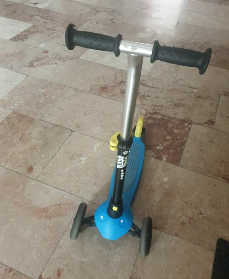 Oxelo B1 marka, Mavi renkte, ön direksiyon yüksekliği ayarlanabilir, 3tekerlekli, frene sahip , sağlam yapılı ve renkli tasarımlı çocuk scooterı. Dengeli sürüş için önde iki tekerlek ve siyah tutma kolları bulunur.