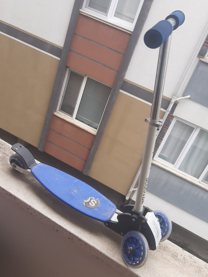 Üç tekerlekli, kolay yönlendirilebilir sağlam tutma kolu olan mavi çocuk scooter'ı.