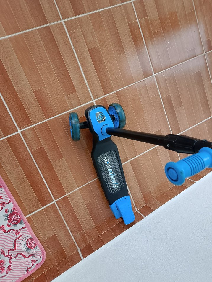 Bu mavi çocuk scooter'ı, renkli tasarımı, sağlam tutacağı ve denge için üç tekerleği ile dikkat çekiyor.