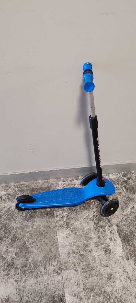 Üç tekerlekli, koyu mavi renkli çocuk scooterı, rahat tutma yeri ve dengeli sürüş sağlar.