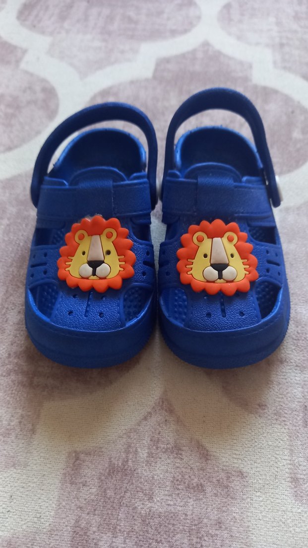 Mavi renkli, cırtcırtlı bantlı çocuk terliği, aslan figürlü sevimli detaylarla rahat ve günlük kullanım için uygundur.