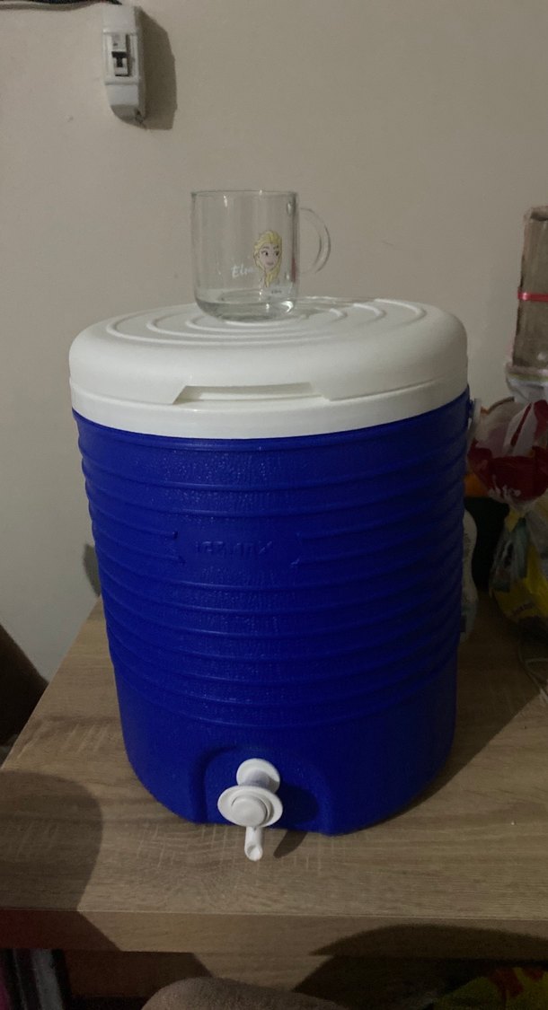 Mavi renkli çocuk termos kabı, beyaz kapak ve kolay dökme için ön musluk içerir. Sıvıları sıcak tutar.