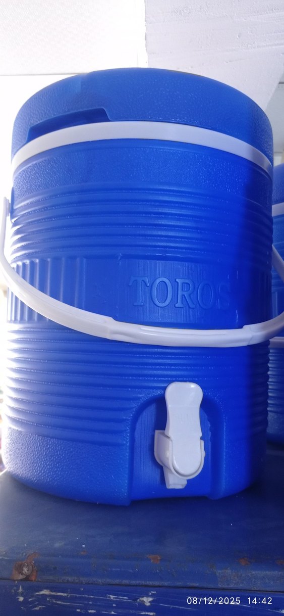 Renkli mavi çocuk termos şişesi, sağlam sap ve kolay dökme için pratik musluk içerir. "TOROS" yazılıdır ve içecekleri sıcak veya soğuk tutar.