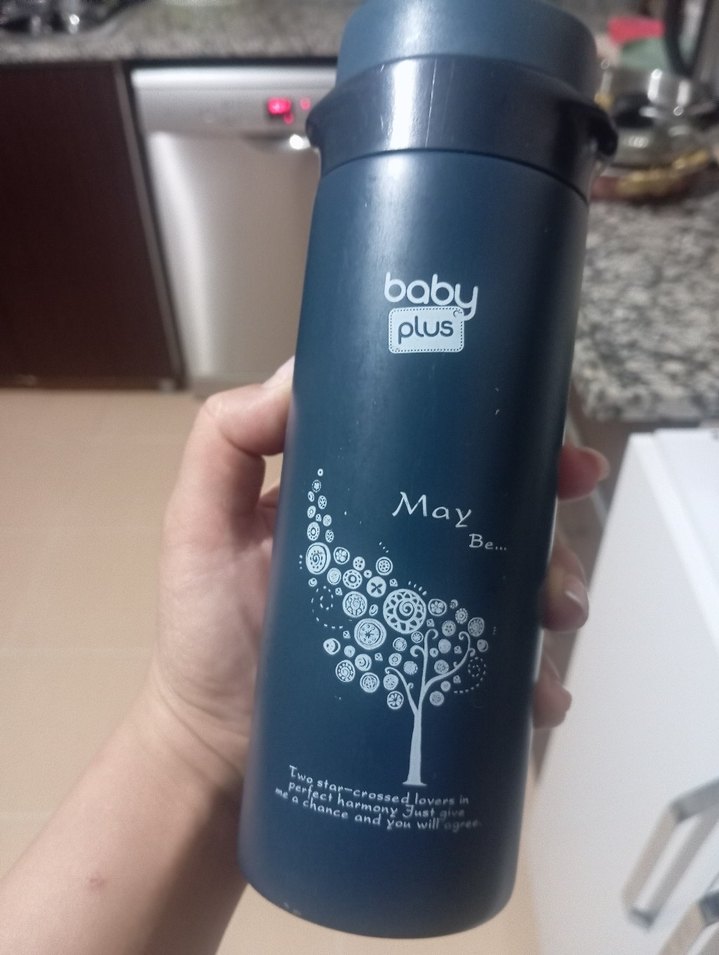 Mavi Baby Plus çocuk termos şişesi, güvenli kapak ve yazılı ağaç desenine sahiptir. İçecekleri sıcak tutmaya uygundur.