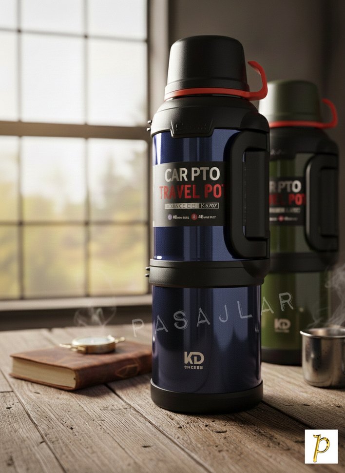 Koyu mavi renkli çocuk termosu, sağlam tutma sapı ve güvenli kapağa sahiptir, içecekleri sıcak tutar. Üzerinde 'CARPTO TRAVEL PO' yazısı vardır.