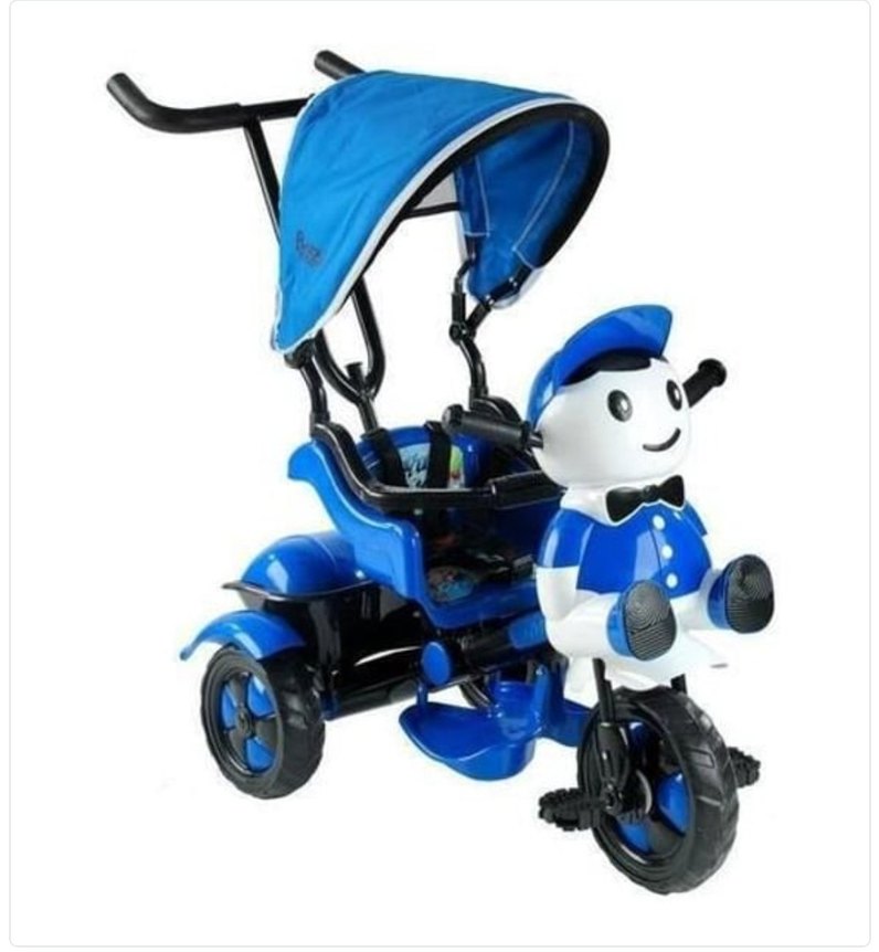 Mavi renkli, şapkalı ve önünde eğlenceli bir figür bulunan çocuklar için renkli üç tekerlekli bisiklet. kargo yapmiyorm