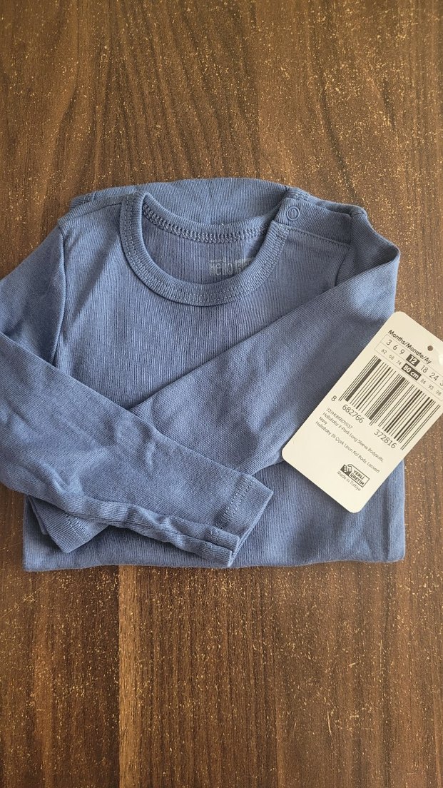 Mavi renkte, yuvarlak yakalı ve kolay giydirme için omuz düğmeli çocuk uzun kollu atlet. Düz ve yumuşak kumaştan üretilmiştir.