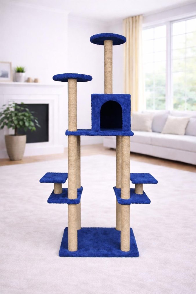Mavi renkli, çok katlı kedi tırmalama ve oyun evi, çeşitli platformlar ve kedilerin tırmanıp dinlenebileceği kapalı alan içerir.